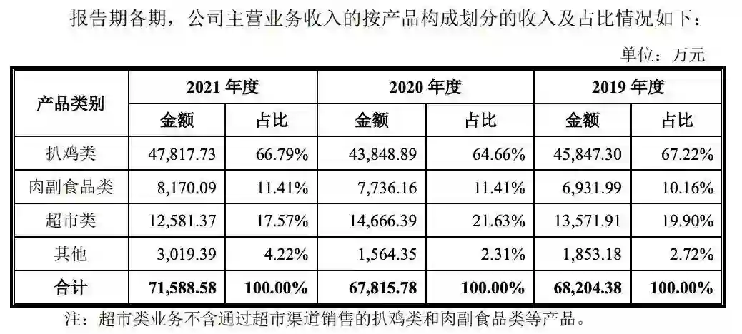 没有意外,扒鸡类产品撑着这家老字号的半壁江山。数据显示,2019年到2021年三年,扒鸡类产品的业务收入分别为4.58亿元、4.38亿元、4.78亿元,占公司主营业务收入的67.22%、64.66%、66.79%。