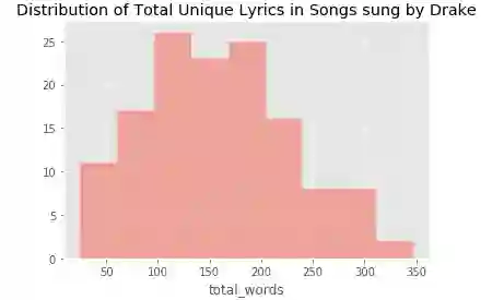 完成文本数据的清理之后,我开始分析每首歌曲中独特词的数量。如下图所示,是 Drake 所有歌曲中独特歌词分布的直方图。他的大部分歌曲似乎都有 100~200 个独特的词。由于我没有分析其他歌手歌词的情况,无从参考,因此这张直方图并没告诉我多少关于 Drake 创造力的内容。