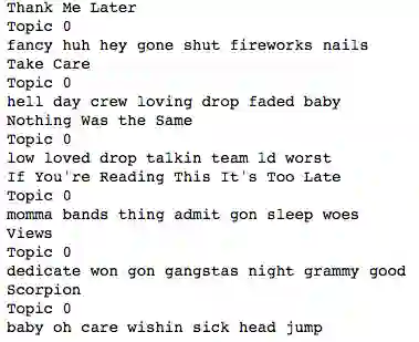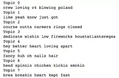 我想使用 LDA 做的的第一件事就是学习 Drake 所有歌曲中最突出的主题。为了做到这一点,我把所有的歌都列在了一个列表里。然后,利用 SciKitLearn 的 CountVectorizer,我创建了一个词袋(Bag Of Words)表示所有这些歌曲。词袋是通过矩阵表示(matrix representation)来表示单词的一种简单方法。然后使用 SciKit 学习 LDA 版本,我建立了一个模型,在给定的文本中,找到 8 个主题。