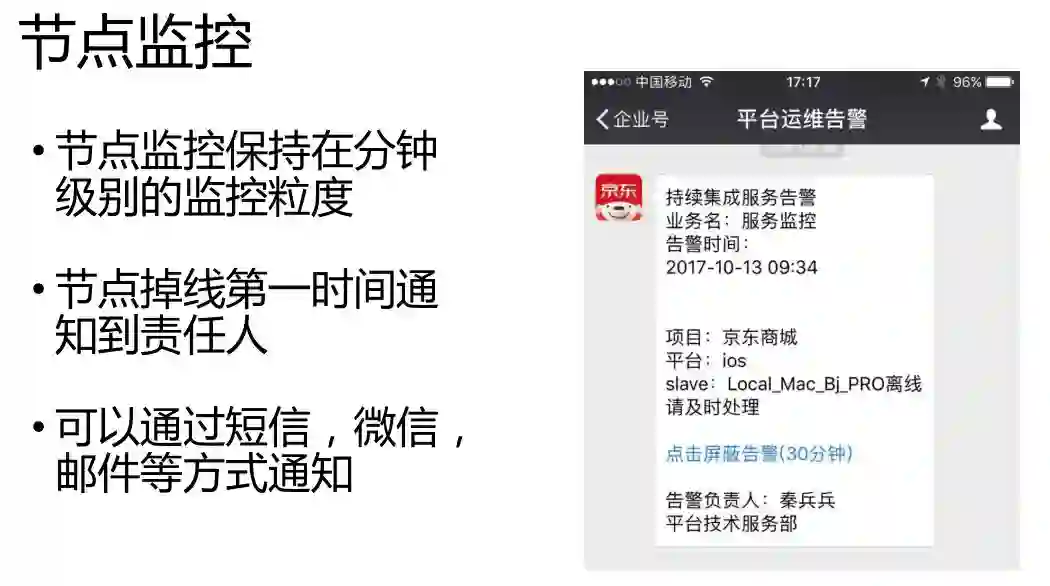 节点的监控,也是节点管理的一部分。节点监控我们是保持在分钟级别的,能够在第一时间发现如果某一个节点出现问题,会有第一时间的微信告警,责任人收到这个告警以后,我们就会修复出问题的节点,保证所有的服务是可用的。第一时间解决问题,不能让掉线的节点或者出问题的节点一直在那边不知道。
