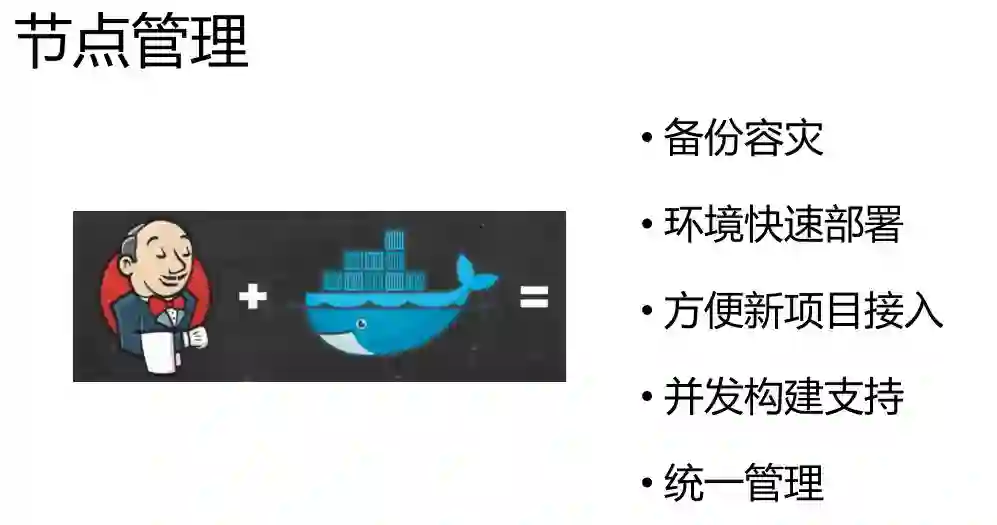 接下来我讲一下节点管理。Jenkins自带节点管理,其做的也非常好。他的master /slave机制允许你可以对Job做并发构建。京东这一块主要是做混合的节点管理,有用到master/slave,也有用到我们自己的一套东西。我们这边的节点主要是Docker加Jenkins的环境。