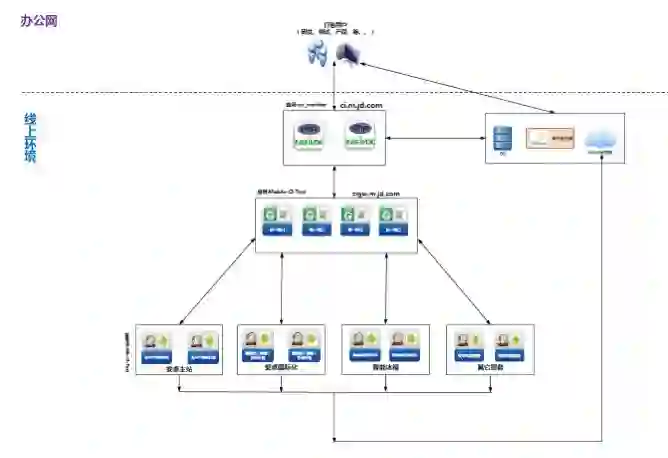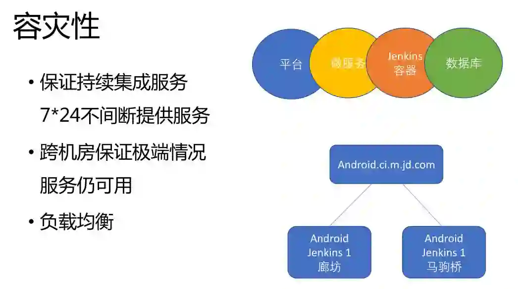 同时这边的Jenkins容器服务,甚至还设计了跨机房的服务。这样保证在极端的情况下即使是一个机房出问题了,机器全挂了,另外一个机房可以保证还能使用。