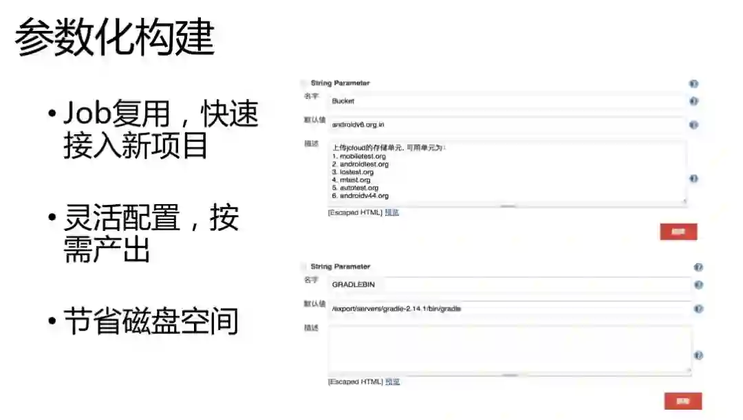 参数化的构建。我们每一个Job的构建,是尽量用到参数化,参数化最大的好处是可以做到Job的复用。大家在新建Job的时候大部分的配置是一样的,在大部分配置一样的情况下,如果在一个Jenkins list里面有成百上千个Job,这些Job是不是可以做这个参数化的合并。大部分的Job是不是可以通过参数化合并在一起。
