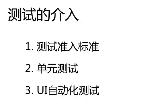 测试的介入,有测试准入标准、单元测试和UI自动化测试。每日的自动测试还会涉及到一些代码扫描和接口自动化。