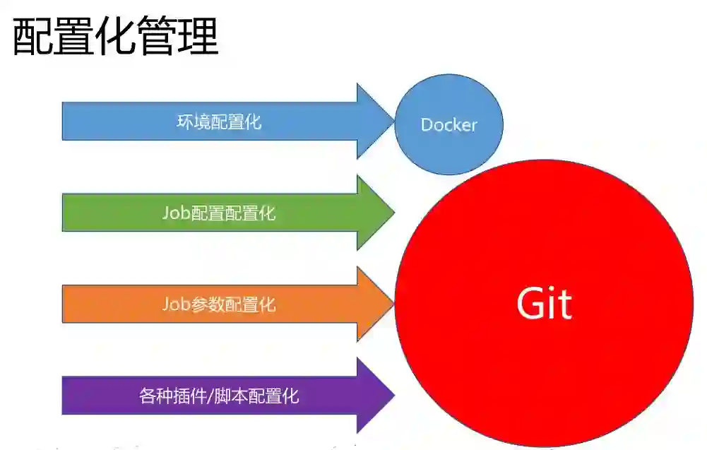 配置化管理是比较重要的,我认为是持续集成核心的东西。我们环境配置化可以通过Docker实现,我们Job的配置化,一些Job参数化的东西,以及各种插件、各种本地编写的脚本,这些东西全部可以通过版本管理工具做这样的配置。