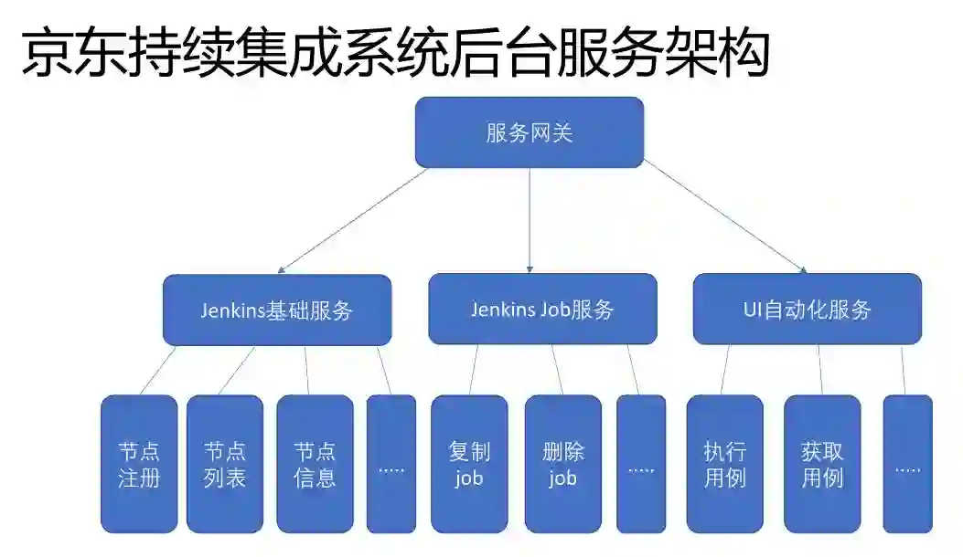 这是持续集成中间微服务的架构。主要是服务网关进来的,是按照功能模块做服务划分的,涉及到Jenkins的基础服务,Job服务。这个涉及到Jenkins基础服务,我们的节点管理就会通过使用一些基础服务做我们自己节点的调度管理工作。