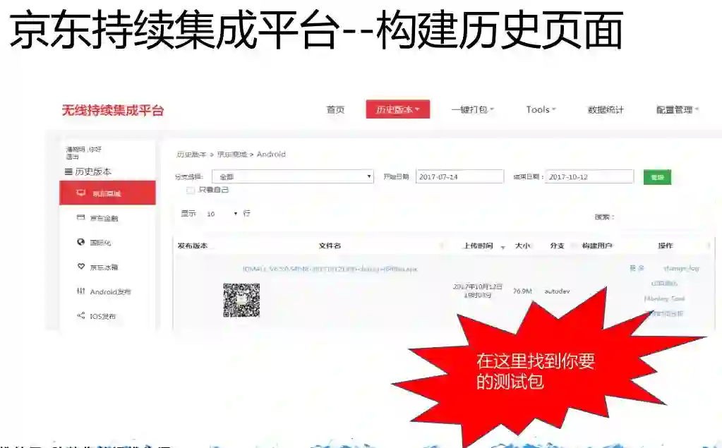 这就是构建历史的界面,可以拿到历史上的和你上一次构建完的测试包。这里有包名、上传的时间,包的大小,是在哪一个分支、哪一个用户触发的,这些信息都可以看到。