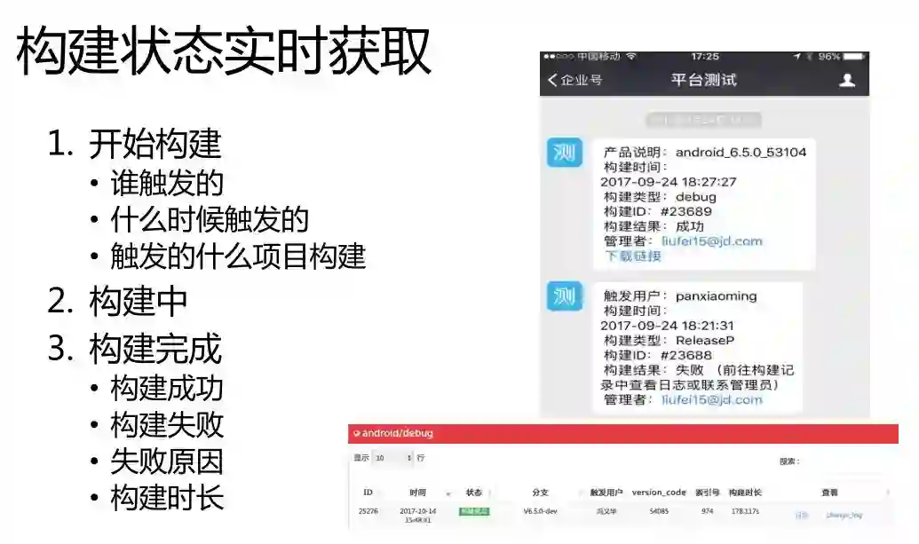 这个告警信息会包括本次构建和上次成功之间代码的差异。还有这次构建是谁触发的,开发是谁提交的。开发的老板是谁,这些信息都会告警出来。