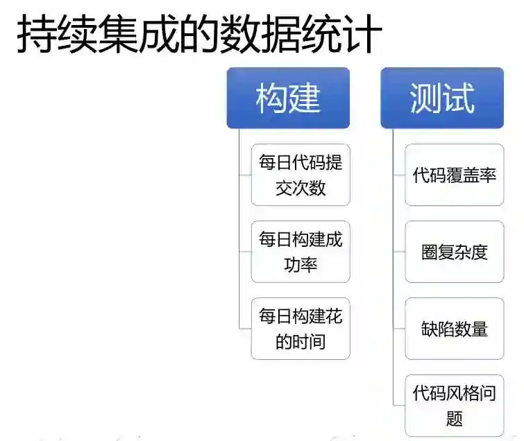 单元测试讲完了以后,可以跟构建信息集成起来了,构建代码提交次数、构建成功率、每次构建花的时间,这是从构建的角度做的数据统计。