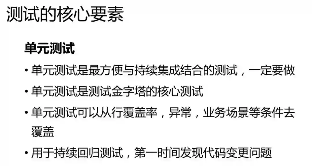 单元测试其实是跟集成测试最方便集成的东西,这一定要做。因为他的投入产出比非常高,很多问题不通过黑盒的方式,通过单元测试就能够发现。单元测试是整个测试金字塔最核心底层的东西。