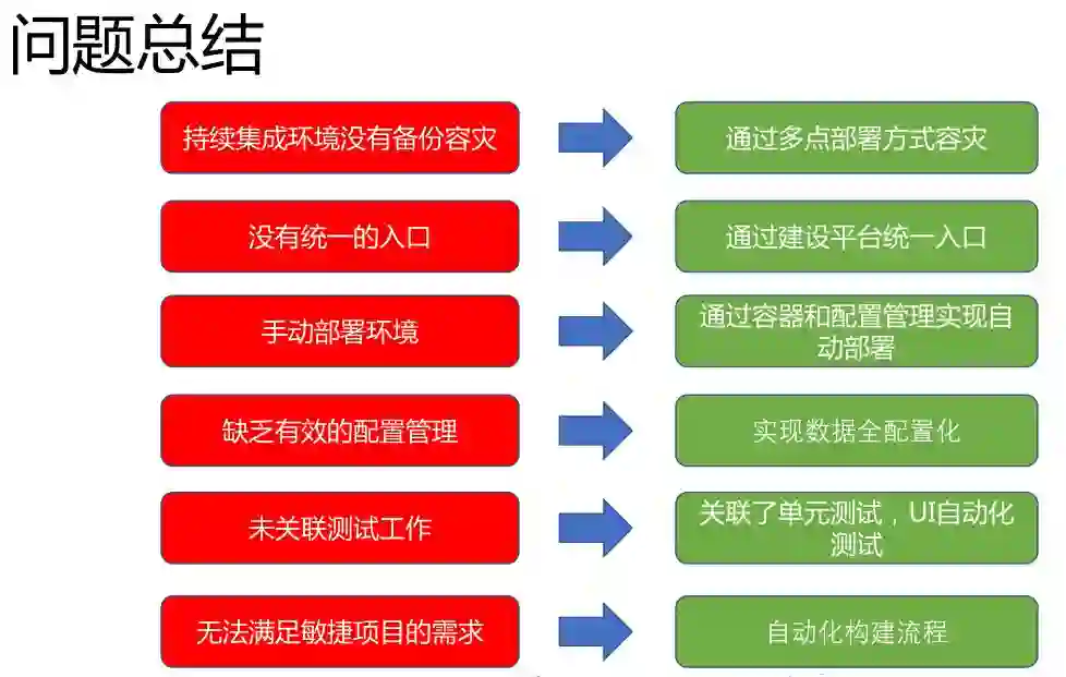 这里总结一下刚刚提到所有的问题。没有备份环境就通过多点部署。没有统一入口是使用持续集成平台,通过平台做统一功能封装和项目管理。