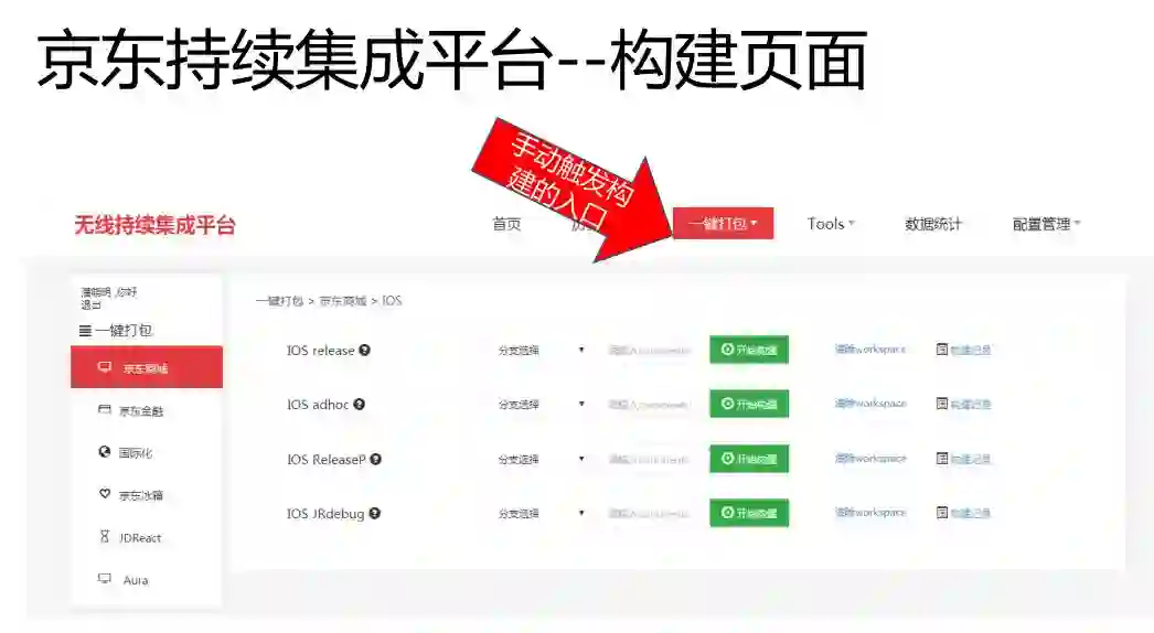 这个是持续集成平台的手动构建的界面,左边的菜单是现有加入到持续集成的项目,比如说京东商城、金融、京东冰箱。