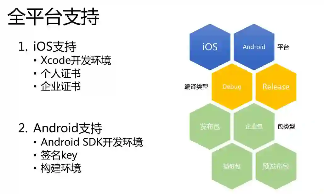 全平台的支持。我们这边是IOS和安卓两个平台的构建,需要依赖的一些环境支持。我们编译的类型也是支持Debug和Release的包,也包括发布包、企业包、预发布包。
