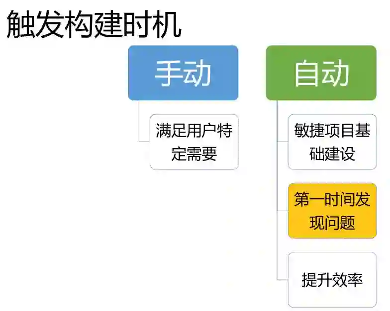 先说一下构建时机。平台上手动触发的构建,这是按照用户需要。还有是自动构建。可能有同学想到说构建触发机制是怎样的,是按时触发,还是按照开发提交代码后立即触发。我觉得还是根据实际需要,我的建议是按时触发,因为你没有办法判断或更改开发提交代码的频次。