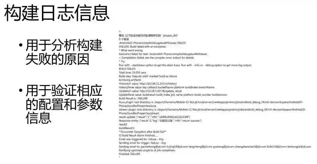 构建失败的话,失败的原因是什么,为什么会失败,我们可以通过这些信息追溯这些构建失败的原因,同时可以验证一些相关参数的使用,是不是正确的。