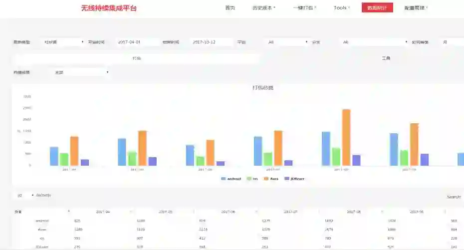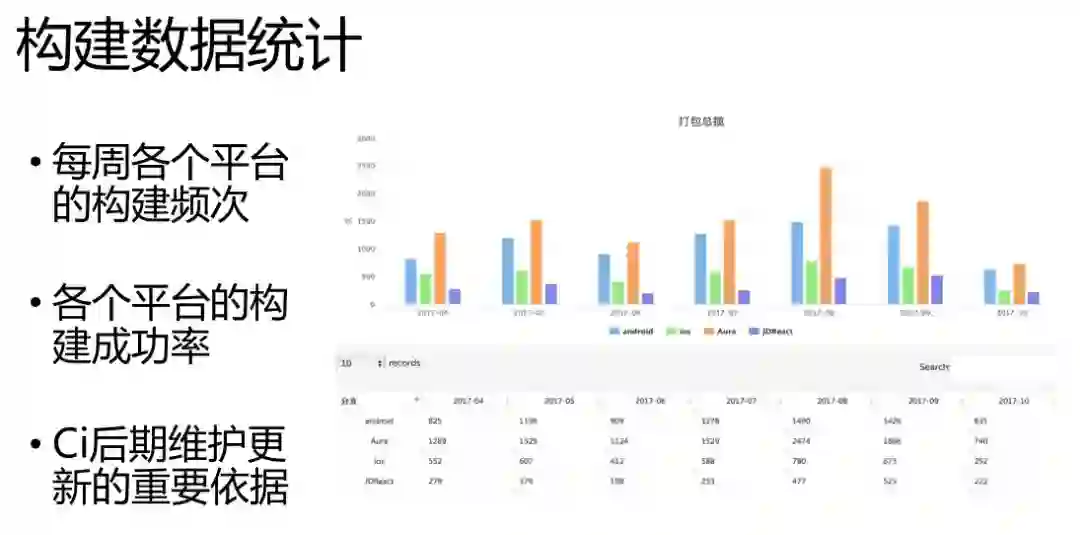 这个就是数据的统计。数据统计基本上是围绕着平台各个项目和模块按时间的纬度,它构建的数据。这个构建数据包括它的成功率,这些数据对我们开发有着鞭策作用,它的成功率低的话是什么原因导致的,为什么会经常出现编译失败的情况。
