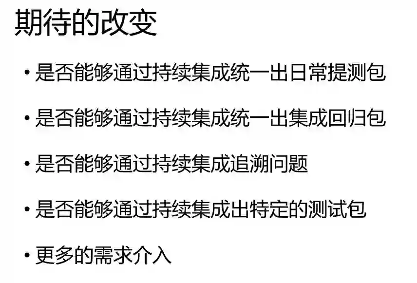 我们期待能够通过持续集成统一出日常提测包,这样就不需要找开发进行对接了。我们需要有一个统一的持续集成平台来拿到提测包。同时我们能够通过持续集成追溯哪个包或哪个构建的时候出的问题。我们也希望有特殊的插桩测试包能够通过持续集成帮我们做到,而不需要我们自己每个人打自己特定的包,最后还有更多需求的介入。
