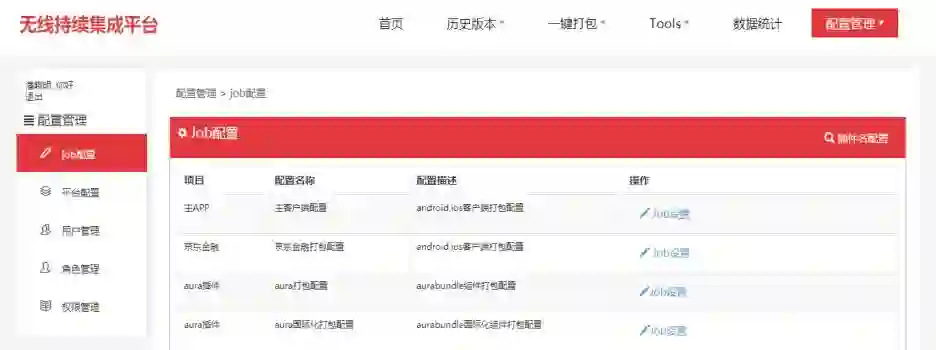 这是配置管理页面,主要是做前端的Job和后台Jenkins Job做映射,同时提供了平台的配置、用户管理。提到用户管理这里所有的平台,在每个用户进来的时候都可以配置一套权限,当你被赋于一种权限的时候,例如仅赋予你安卓权限,你是不能打IOS包的;你是构建打Release包,你不能打Debug包。主要是在这里做权限管理。