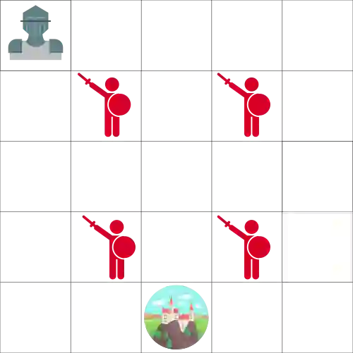 您可以一次移动一个图块。敌人不能移动,但是骑士和敌人落在同一块地砖上就会死。目标是使骑士尽可能以最快的路线前往城堡。这可以使用“积分”系统来评估。