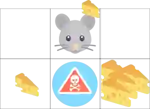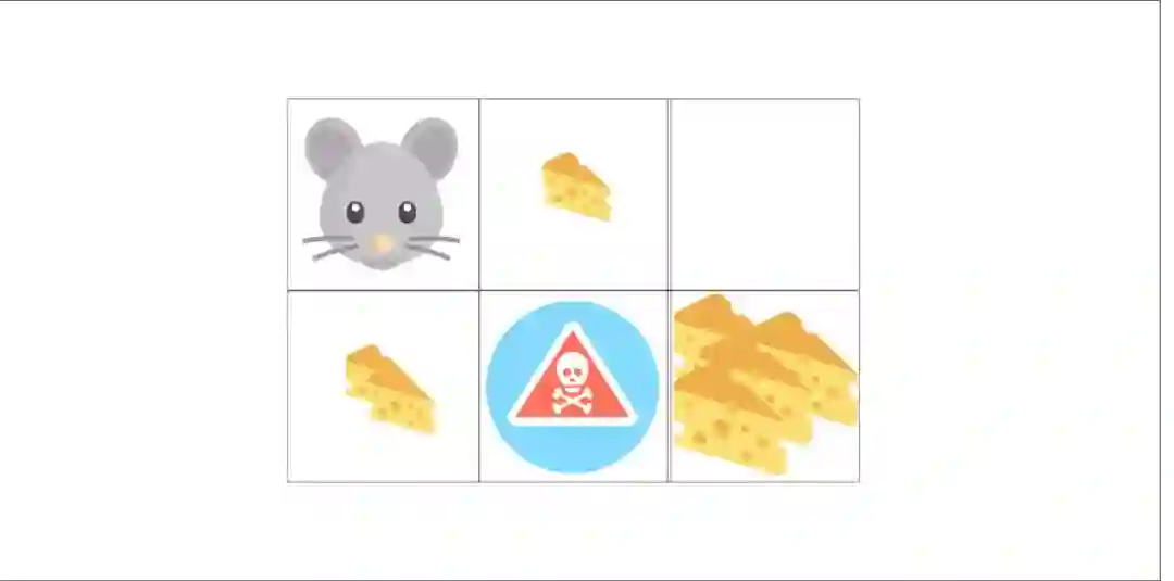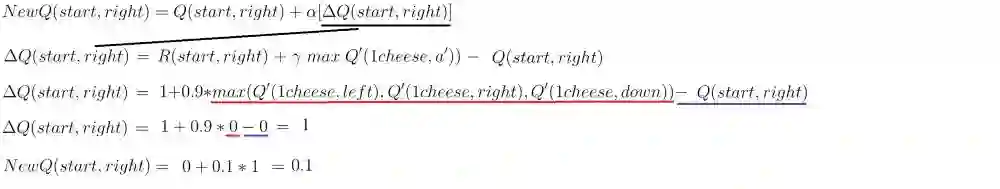 发现了一块奶酪(+1),则更新的Q值并记录向右的行动。通过Bellman方程来进行计算。