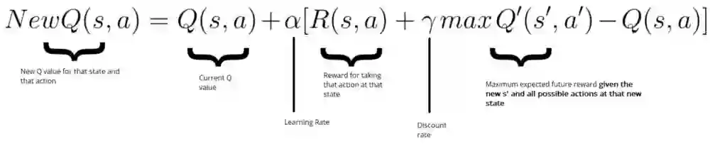 lr * [Reward + discount_rate * (highest Q value between possible actions from the new state s’ ) — Current Q value ]