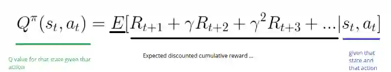 如果在 state 状态下给定的行动 action 是最佳策略,那么每个 Q 表评分为未来奖励的最大期望。
