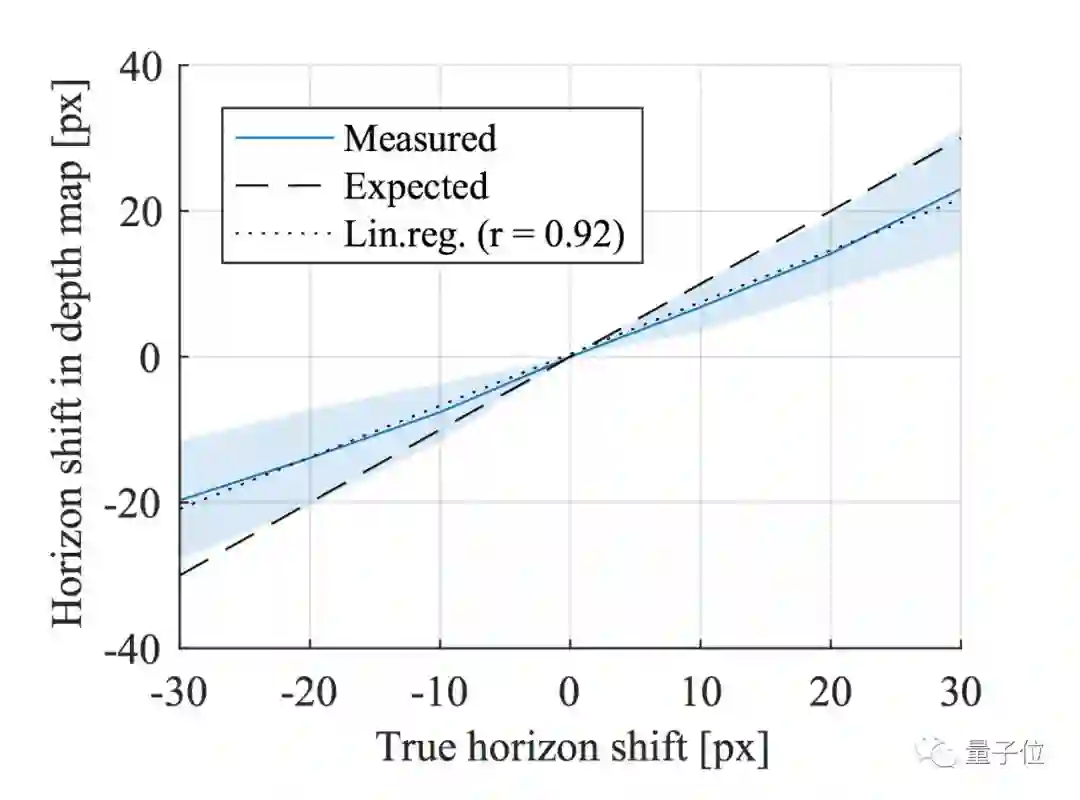 但是在第三行中,保持物体的纵坐标不变,只是缩放大小,整个神经网络的输出其实相当一致,并没有剧烈变化。(都注意预测中白框内的结果即可,也就是车尾的距离)下面是一个定量的结果: