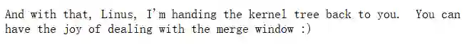 随后,Kroah-Hartman 在公告中写道,“Linus,我正在将 kernel tree 交给你。你可以继续享受处理合并窗口的乐趣。”