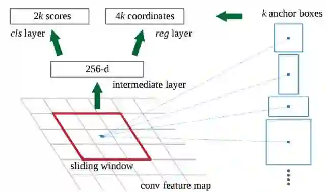 •在初始CNN的最后一层,3x3滑动窗口移动到特征映射上,并将其映射到较低维度(例如256-d)。