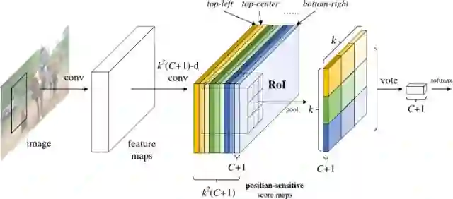 2.添加一个完整的卷积层以产生上述“位置敏感分数图”的分数库。应该有k²(C + 1)个分数图,其中k ^2表示用于划分目标的相对位置数(例如,3^2表示 3×3网格),C + 1表示类加上背景的数量。