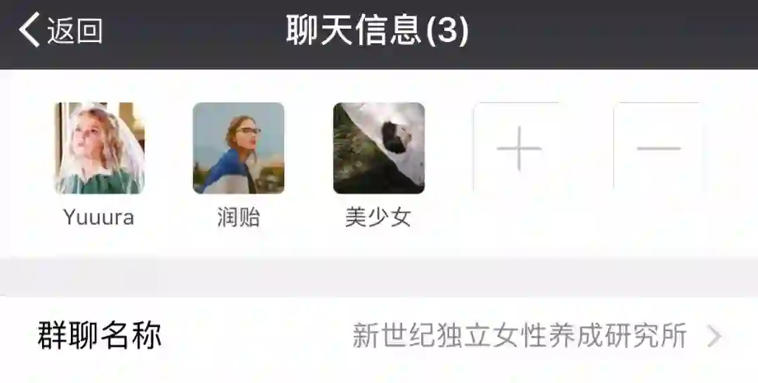 首先看到,我们的群名是“新世纪独立女性养成研究所”,我们的口号是“男人都是大猪蹄子”!两位好友分别是“润贻”和不愿意透露姓名的“美少女”同学(不慌,文末有惊喜,嘻嘻)。