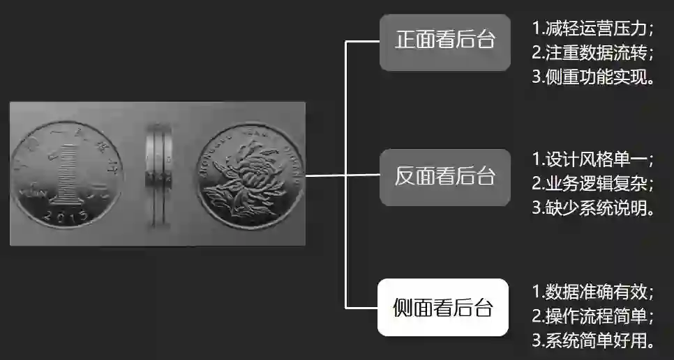 在做后台产品设计之前,我们先从硬币的三个面了解一下后台系统。从硬币正面看后台:可以减轻运营的压力,注重数据之间的流转,侧重功能模块的实现。从硬币反面看后台:设计风格过于单一,业务逻辑复杂,缺少对应的系统说明。从硬币侧面看后台:数据处理准确有效,操作流程简单,系统简单好用。