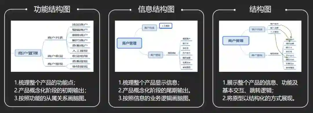此外,产品结构设计也是梳理业务逻辑很重要的一部分。产品结构设计侧重基于功能构建产品的整体架构,主要是梳理产品框架和基本功能。一般会设计功能结构图、信息结构图、结构图。