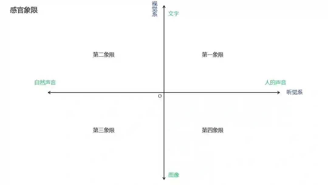 那么,我们以听觉系为X轴、视觉系为Y轴,建议二维直角坐标系。听觉系的两端为人的声音(以语言为主)、自然声音;视觉系的两端则是文字和图像。