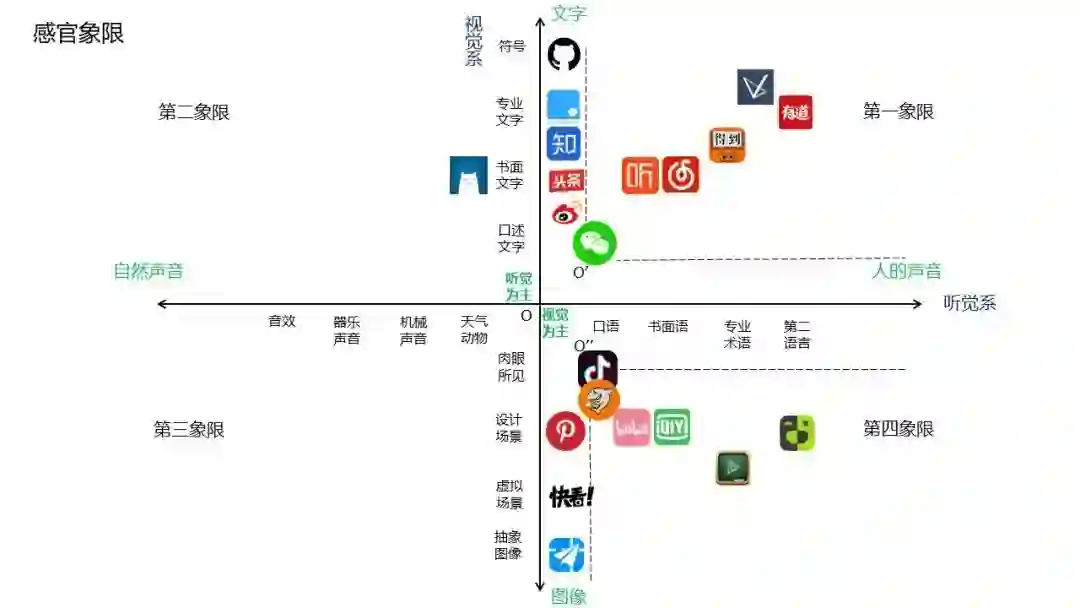 按这样的形式,我们可以把互联网中主要功能为信息传递的产品(以某个特定的产品来代表其类型的产品),填入感官象限中(为了区分产品需要的是单一感官和两种感官,我用 O’ 和 O’’ 将需要两种感官的象限重新作了划分)。