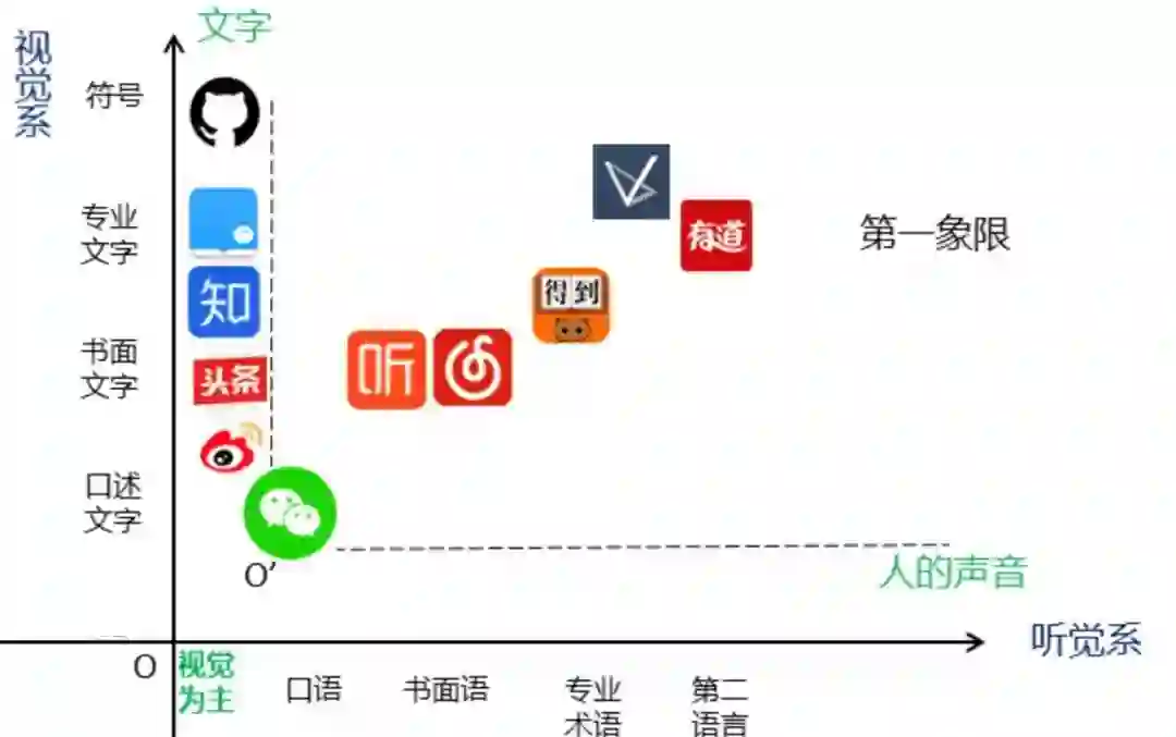 在第一象限中,从微博类产品到 Github 类产品,属于文字类型的难度逐渐上升的结果,看的人会逐渐减少。