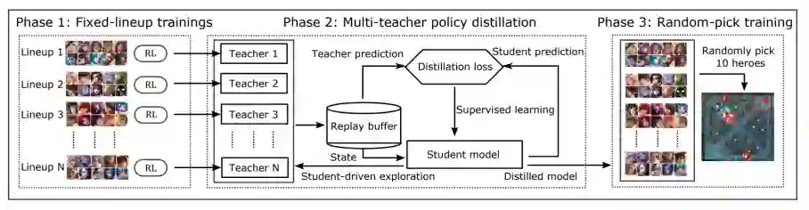 为了应对多英雄组合问题,技术团队先采用引入「老师分身」模型,每个AI老师在单个阵容上训练至精通,再引入一个 AI 学生模仿学习所有的AI老师,最终让「绝悟」掌握了所有英雄的所有技能,成为一代宗师。