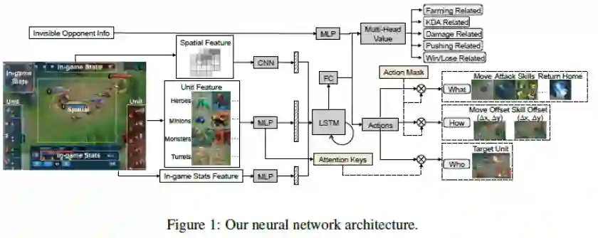 首先构建了一个最佳神经网络模型,让模型适配MOBA类任务、表达能力强、还能对英雄操作精细建模。模型综合了大量AI方法的优势,具体而言,在时序信息上引入长短时记忆网络(LSTM)优化部分可观测问题,在图像信息上选择卷积神经网络(CNN)编码空间特征,用注意力(Attention)方法强化目标选择,用动作过滤(Action Mask)方法提升探索效率,用分层动作设计加快训练速度,用多头值估计(Multi-Head Value)方法降低估计方差等。