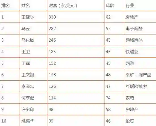 华人富豪则没人能进前十,排名最高的是第 18 位的阿里巴巴创始人马云,净资产达 354 亿美元 。李嘉诚、马化腾和王健林分列 21、23 和 24 位,净资产分别为 332 亿美元、324 亿美元和 304 亿美元。