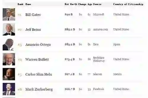 其中,微软公司创始人比尔·盖茨以 900 亿美元的净资产位居榜首,比排名第二的亚马逊创始人杰夫·贝佐斯要多 48 亿美元,贝佐斯目前的个人财富为 852 亿美元。