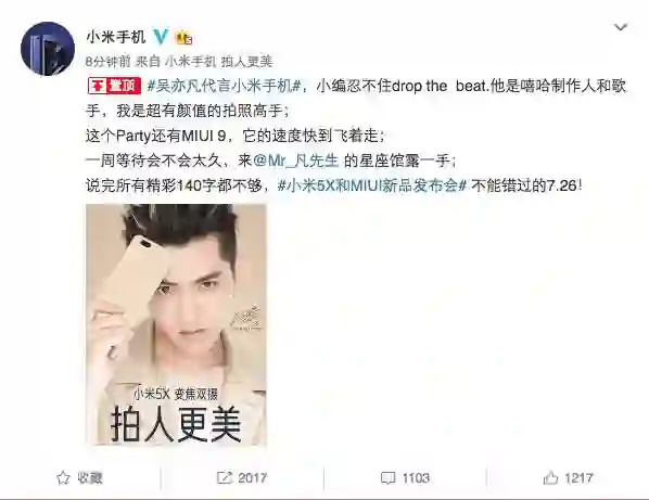 今天下午 14:00 ,小米宣布吴亦凡将代言小米手机,并将在本月 26 日在北京国家会议中心举行新品发布会,发布 MIUI 的大迭代版本 MIUI 9 以及一款双摄新机小米 5X 。凑巧的是,在昨天,魅族也宣布将在本月 26 日在大本营珠海召开 PRO 新品发布会,而将要发布的产品是魅族 PRO 7 以及旗下高端耳机 Flow ,没想到两家发布会日期竟然凑到了一起,这下 26 号有看头了。