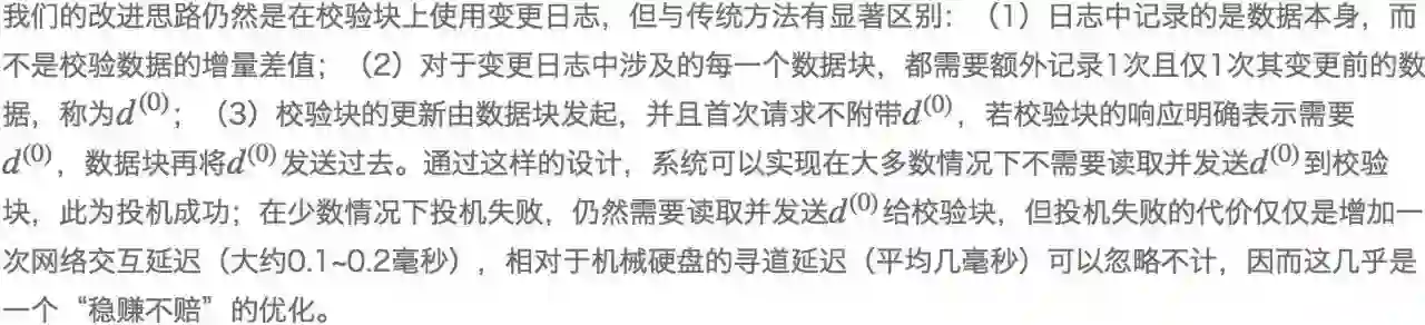 目前业内已有许多工作对这一问题进行改进,其中最具代表性的工作是2014年发表在FAST技术会议上的“Parity Logging with Reserved Space: Towards Efficient Updates and Recovery in Erasure-coded Clustered Storage”,它的核心思路是通过在校验块上记变更日志的方式来减少其上不必要的读操作,同时将随机写变成顺序追加写,以改善写入性能。然而它并不能改善原始数据块上的写流程,这构成了大多数的写操作,所以系统总体写性能改善有限。