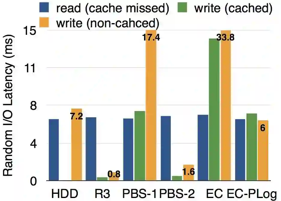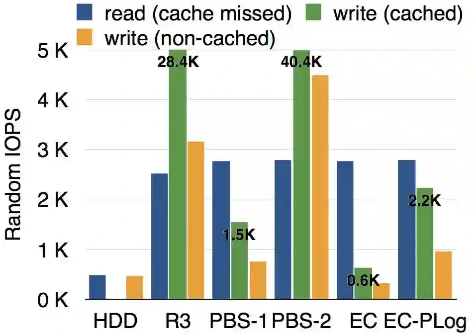 所有的测试均在虚拟机内挂载PBS完成。我们的测试环境为3台服务器,每台配备10块硬盘,7200RPM。测试了随机写IOPS,以及随机写的延迟,来衡量部分写的性能,其中I/O大小为4KB,EC组的条带大小为16KB。测试结果分别如下图所示,其中HDD表示单块7200RPM的物理硬盘的基准性能,R3表示三副本模式,PBS-1和PBS-2分别表示PBS在投机失败(首次写)和投机成功(第二次及以后)的情况,EC表示增量编码方法,EC-PLog表示前文所述的在FAST'14技术大会发表的工作,代表了已有方法中的最好结果。