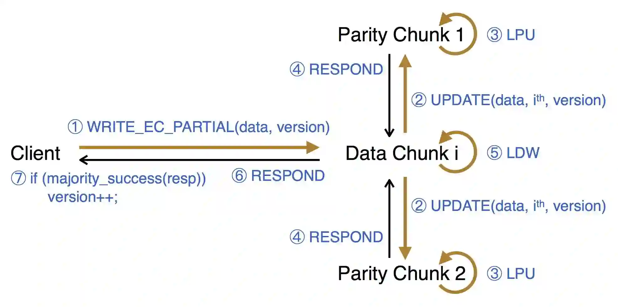 EC给写操作带来了很大的额外开销,包括编解码计算开销和流程性开销两部分。在向量指令集SSE、AVX等的帮助下,一个现代CPU核心的EC编解码能力就可以达到几GB到十几GB每秒,远远大于存储设备的I/O吞吐率。这使得流程性开销成为EC写入性能的最重要制约因素。若一次写操作的偏移和长度没有对齐EC组,就需要部分更新涉及的EC组,因而将此类操作称为部分写。部分写带来了大部分的流程性开销。