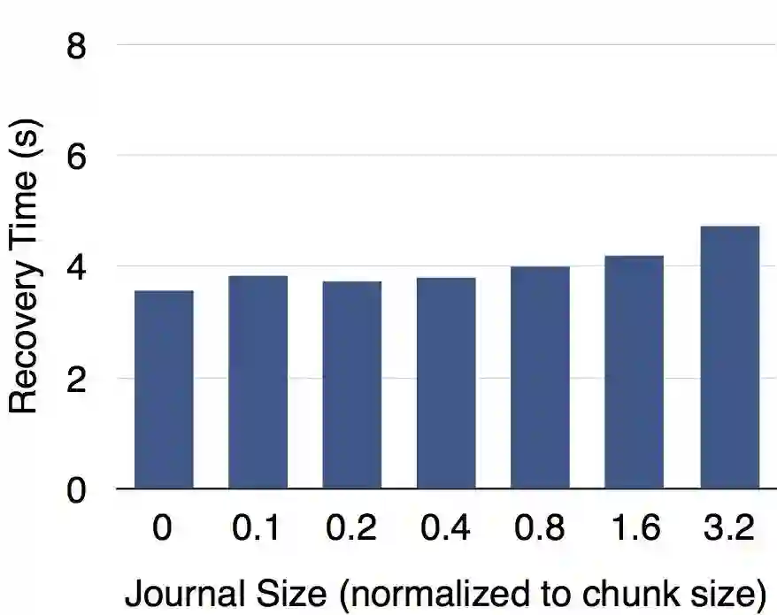 我们在内存中为日志建立了索引,因而在(故障恢复中)读取日志时可以快速定位数据偏移。如下图所示,测试结果表明日志大小对故障恢复速度的影响有限。