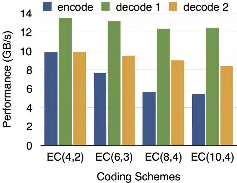 我们针对EC(4,2)、EC(6,3)、EC(8,4)、EC(10,4)等多种配置测试了编解码运算性能。如下图所示,在SSE、AVX等向量运算指令集的帮助下,现代CPU的1个核心每秒就能完成5~13GB数据量的编解码工作,远远大于同时期各种外部存储设备的吞吐率,所以编解码运算已不再成为EC存储系统的瓶颈。测试中所用CPU型号为Xeon E5-2650v3 @ 2.3GHz,图中encode表示编码,decode 1和2分别表示解码1个和2个数据块。