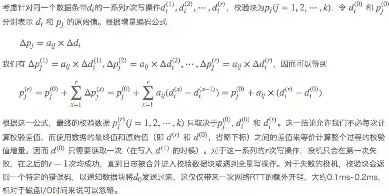 处理部分写的最直接办法是将不被写的数据块读出来,跟新数据组合在一起,然后再整体编码并写入。目前Ceph、Sheepdog等系统都采用了这种办法。一种简单有效的改进是将被覆盖数据的原始值读出来,然后根据新旧数据的差值来进行增量编码,得到各个校验块的差值,并“加”到各个校验块上。这种方法可以显著减少系统总体I/O次数,然而它需要对涉及的数据块和所有校验块进行原地读写(即在同一位置进行先读后写),在没有缓存的情况下(常态),HDD需要花费8.3毫秒(7200RPM)的时间旋转一周才能完成写入请求,跟一次随机I/O的平均寻道时间相当。这样的流程极大地影响了写入效率,即便应用层面发出的是顺序写操作,最终得到的性能也跟随机写差不多。