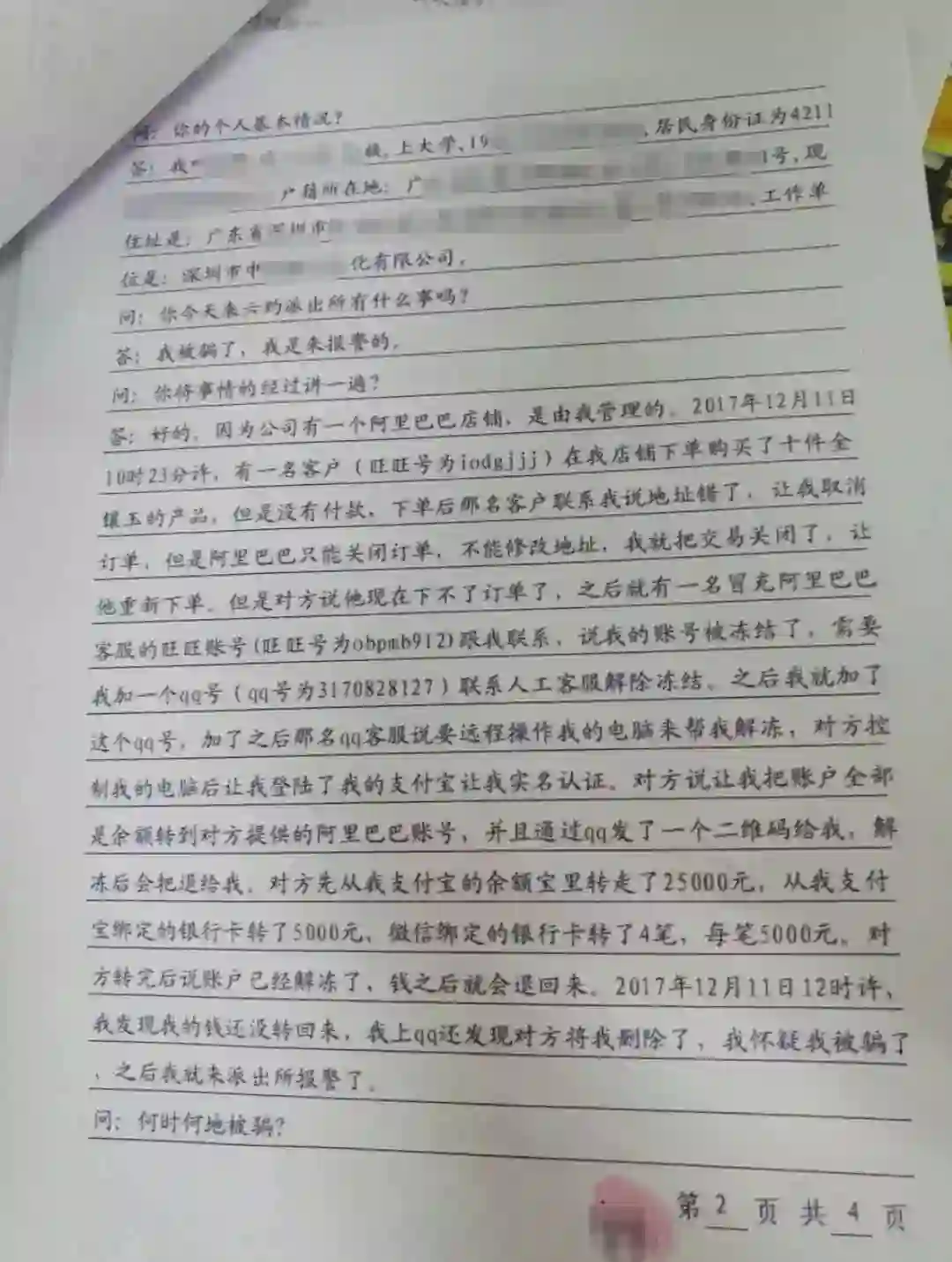 在深圳工作的佟女士负责公司阿里巴巴店铺的经营,主营金银玉器等产品。2017年12月11日,她遭遇了和李先生相同的套路。被嫌疑人以“账号遭遇冻结需要解冻”为由骗取电脑的远程控制后,她扫描对方的二维码进行实名认证,余额宝账户25000元,支付宝绑定的银行卡5000元和微信绑定的银行卡共计4笔单笔5000元,全部被转走,去向也是华多。