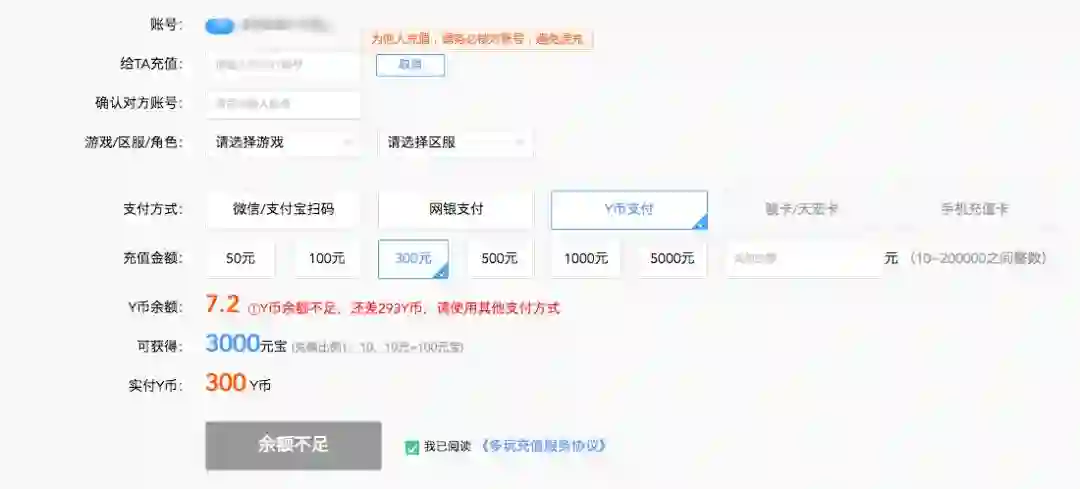 凤凰网科技《风眼》栏目注意到,YY平台上提供多种代充服务,包括YY游戏中心的页游端游充值,支持用户通过代充的方式获得Y币,代充方需要网上支付钱款,也可以通过代充方式获得游戏元宝或点卡,代充方可以用钱也可以用Y币来支付;在YY直播也提供Y币的代充服务,只需要对方的账号即可帮助对方充值Y币。