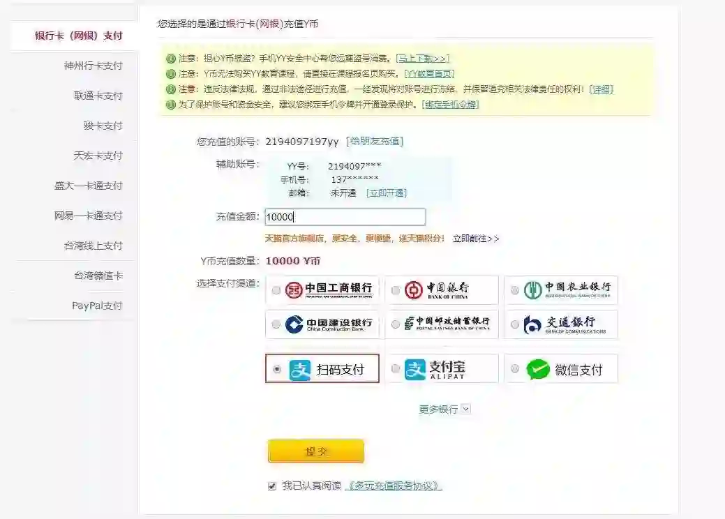 Y币的价格为1元/Y币,单次充值上限为50万Y币。凤凰网科技《风眼》栏目注意到,YY提供了多种支付方式,其中在银行卡(网银)支付中,支持支付宝支付、微信支付、支付宝扫码支付和多个银行的网银支付。其中,不管选择哪种支付方式,在最后一步可以看到收款方就是“广州华多网络科技有限公司”。